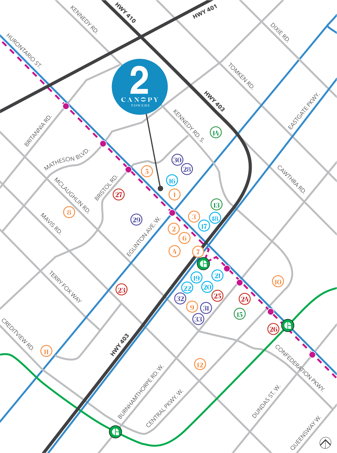 Connection is key and at the core of living at Canopy Towers. Ideally located adjacent to the Mississauga transit intersection, enjoy easy access to the Hurontario LRT, GO Transit and the extensive MiWay transit system. You’re minutes from the Cooksville GO train and bus station connecting you to downtown Toronto’s Union Station in a speedy 30 minutes, making your commute comfortable when using public transport.